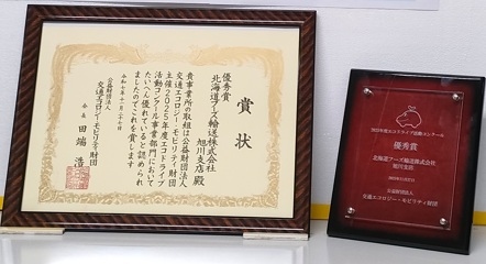 2025年度公益財団法人交通エコロジー・モビリティ財団が主催する「エコドライブ活動コンテスト」に旭川支店と旭川第3センターが参加し、旭川支店が「優秀賞」を受賞しました。